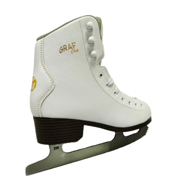 Graf Club är en mycket högkvalitativ konståkningsskridsko för hobbyåkare. Ovandelen är tillverkad av konstläder. Softboot-sko. Skridskon har en stadig och bred läst som passar den finländska foten. Förslipad klinga. Filttunga.